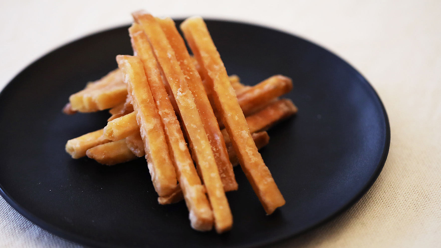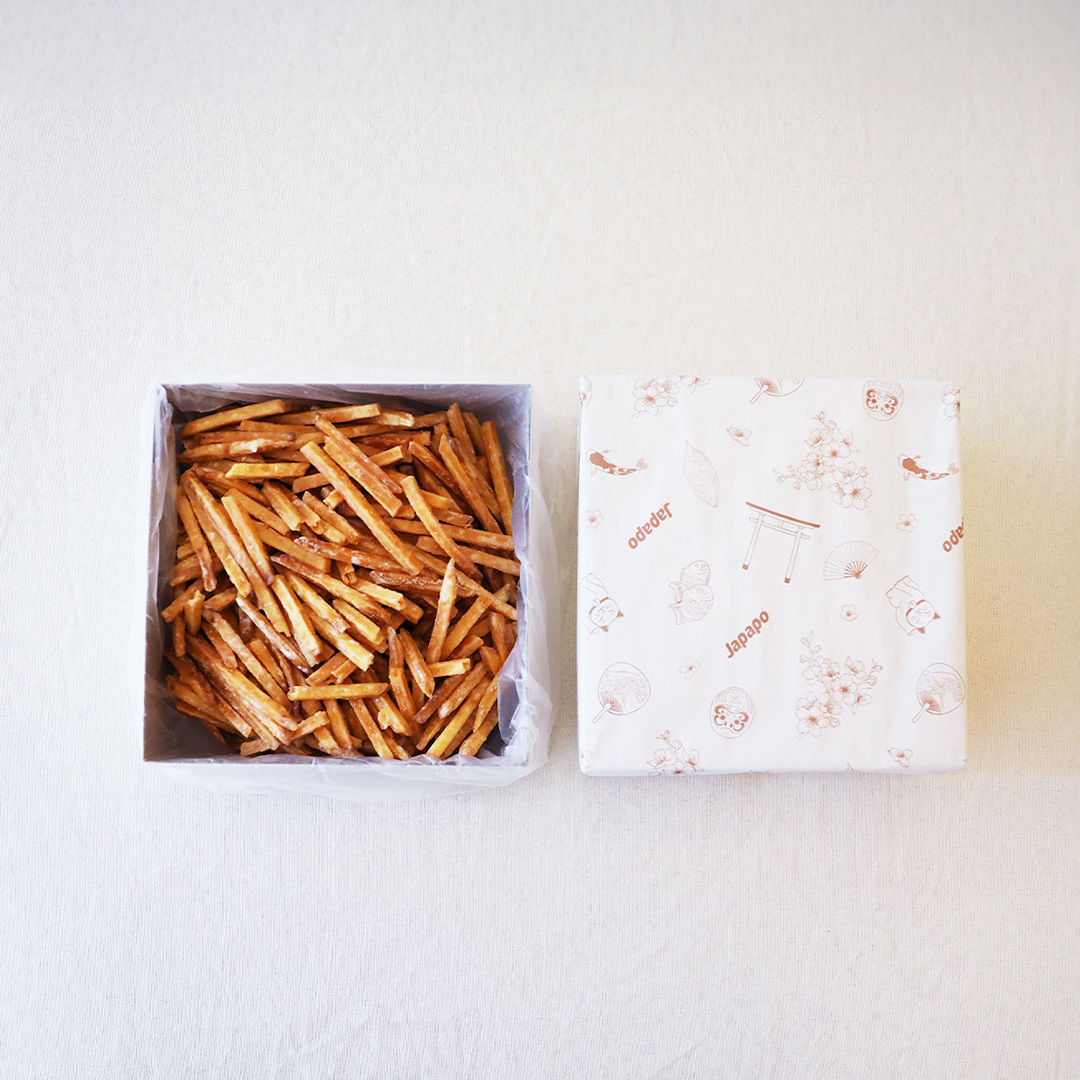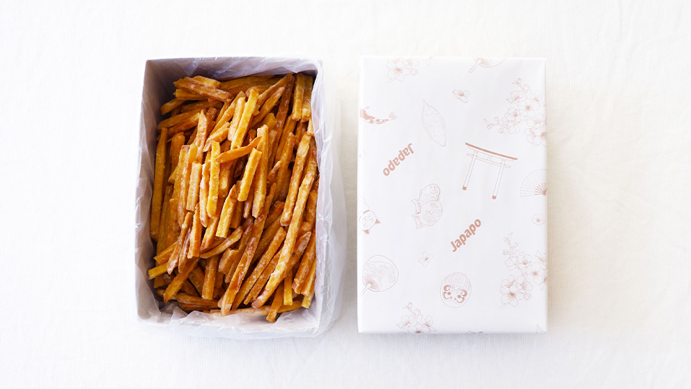 秋の収穫期に掘り立てた良質なさつまいもをその日のうちに揚げ、出荷時にもう一度揚げ直すことで、香ばしさと軽やかな食感を引き立てました。